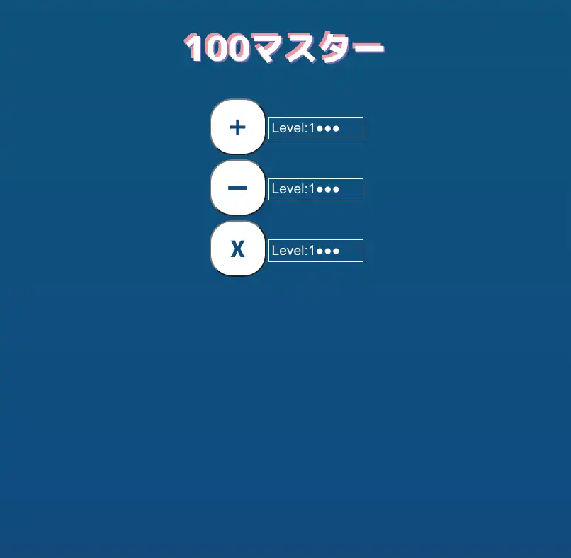 javascriptコンテンツ制作。100マス計算のプログラム、足し算、引き算、掛け算、レベル設定、ローカルストレージでのデータ保存。など。