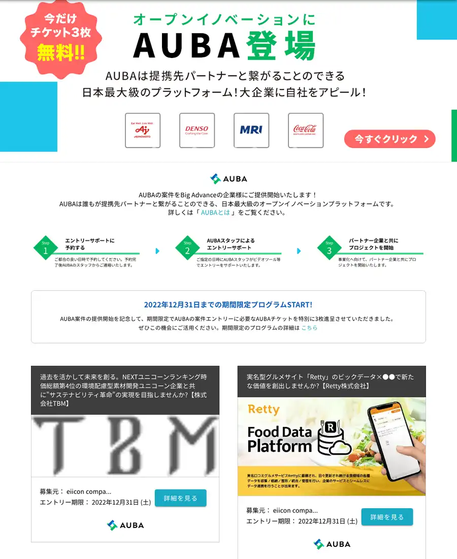 オープンイノベーションの規模拡大のため最大手のAUBAとの提携を行なった。ページのデザインを全般的に行う。