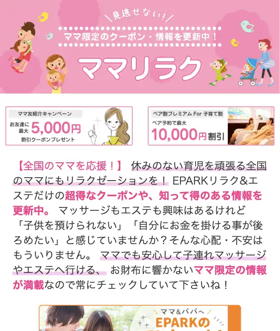 自社の子育て支援の一貫として子供同伴で行ける店舗の紹介とキャンペーンの紹介。実際の口コミを紹介することで安心感を演出。